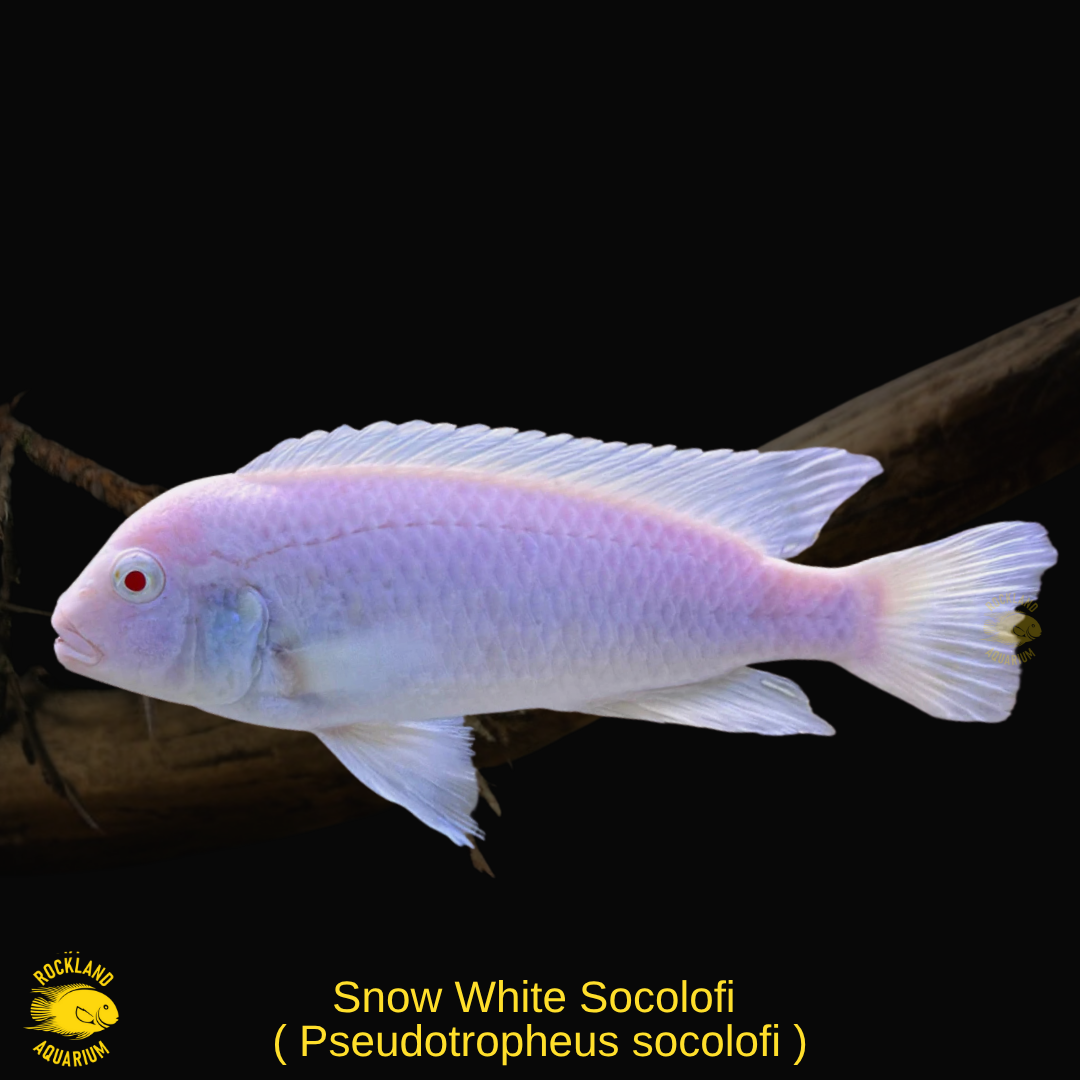 The Snow White Socolofi is a stunning albino variant of the classic Pseudotropheus socolofi, prized for its pure white body and peaceful mbuna temperament. A beautiful contrast fish for African cichlid tanks, this species thrives in rocky environments with stable water parameters.