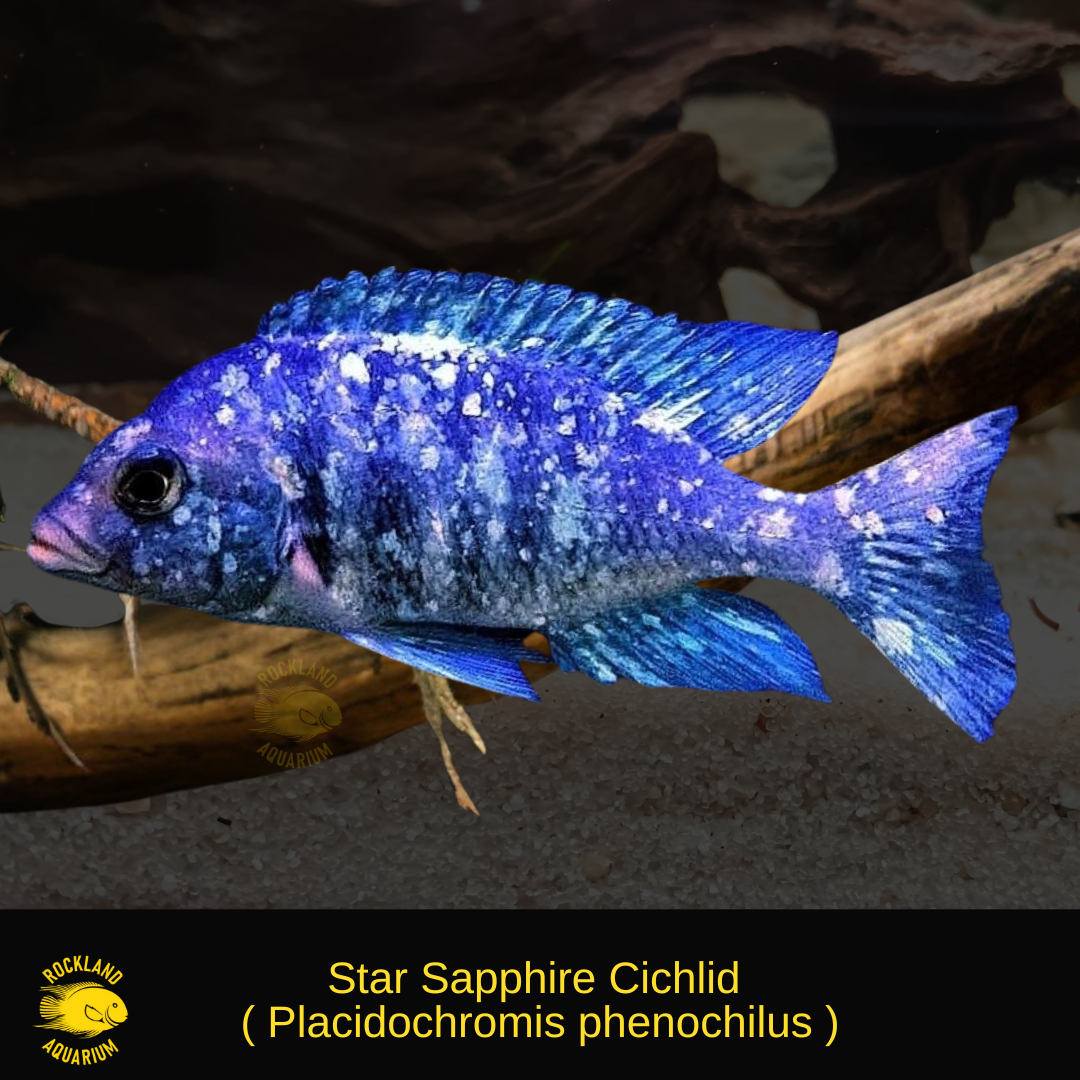 Add a touch of celestial beauty to your aquarium with the stunning Star Sapphire Cichlid. Native to Lake Malawi in Africa, this species is prized for its deep blue body covered in shimmering white "star-like" spots that become more prominent with age and maturity.